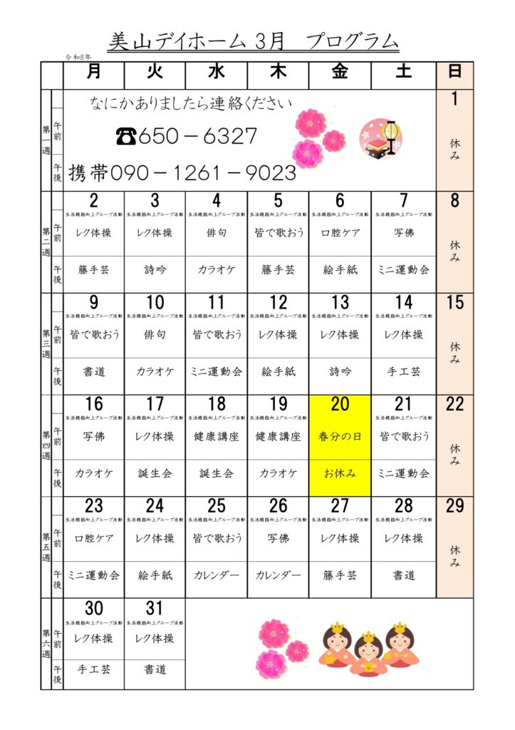 3月の予定表を掲載いたします。